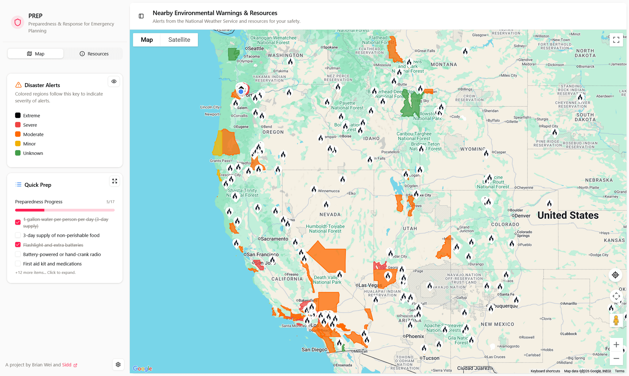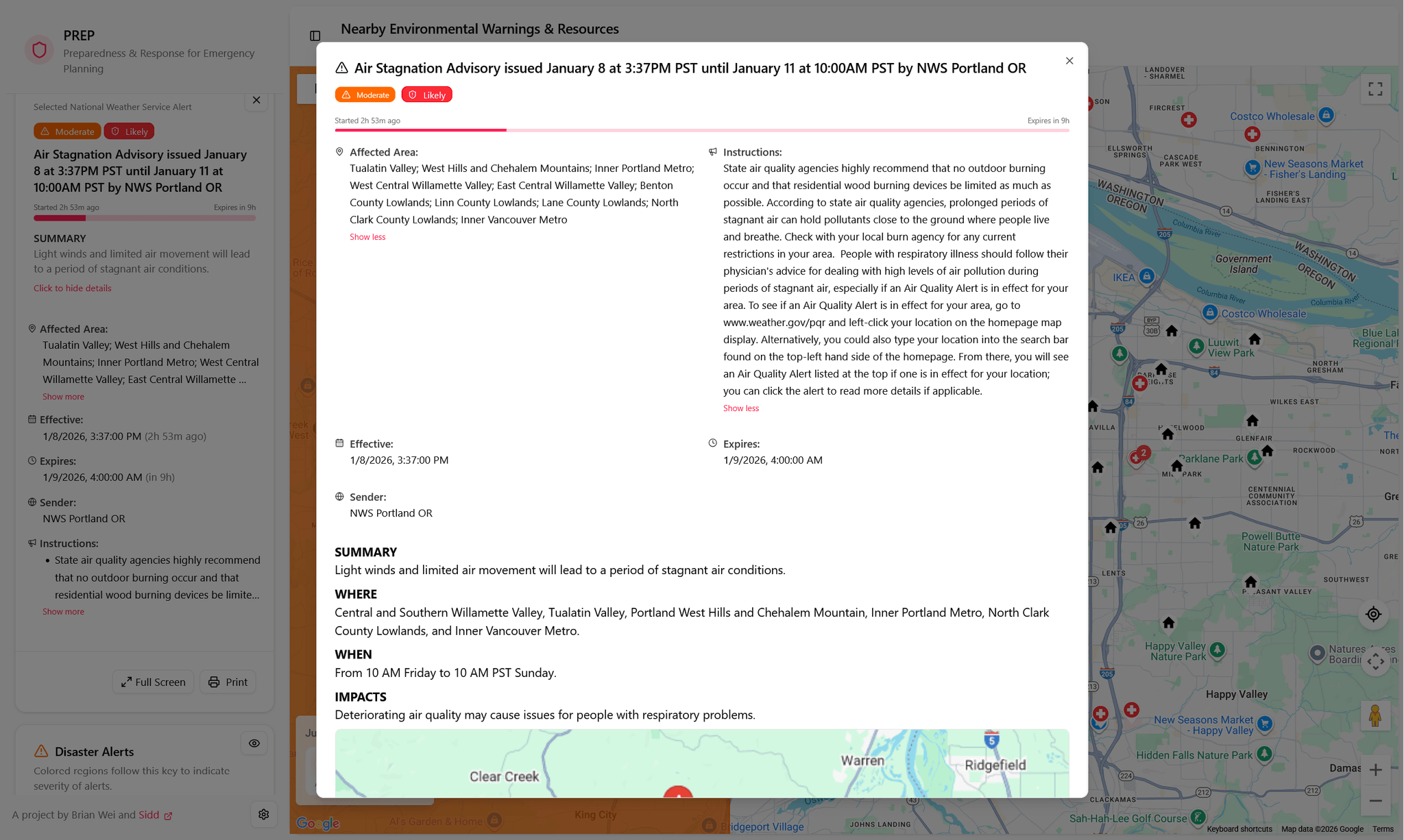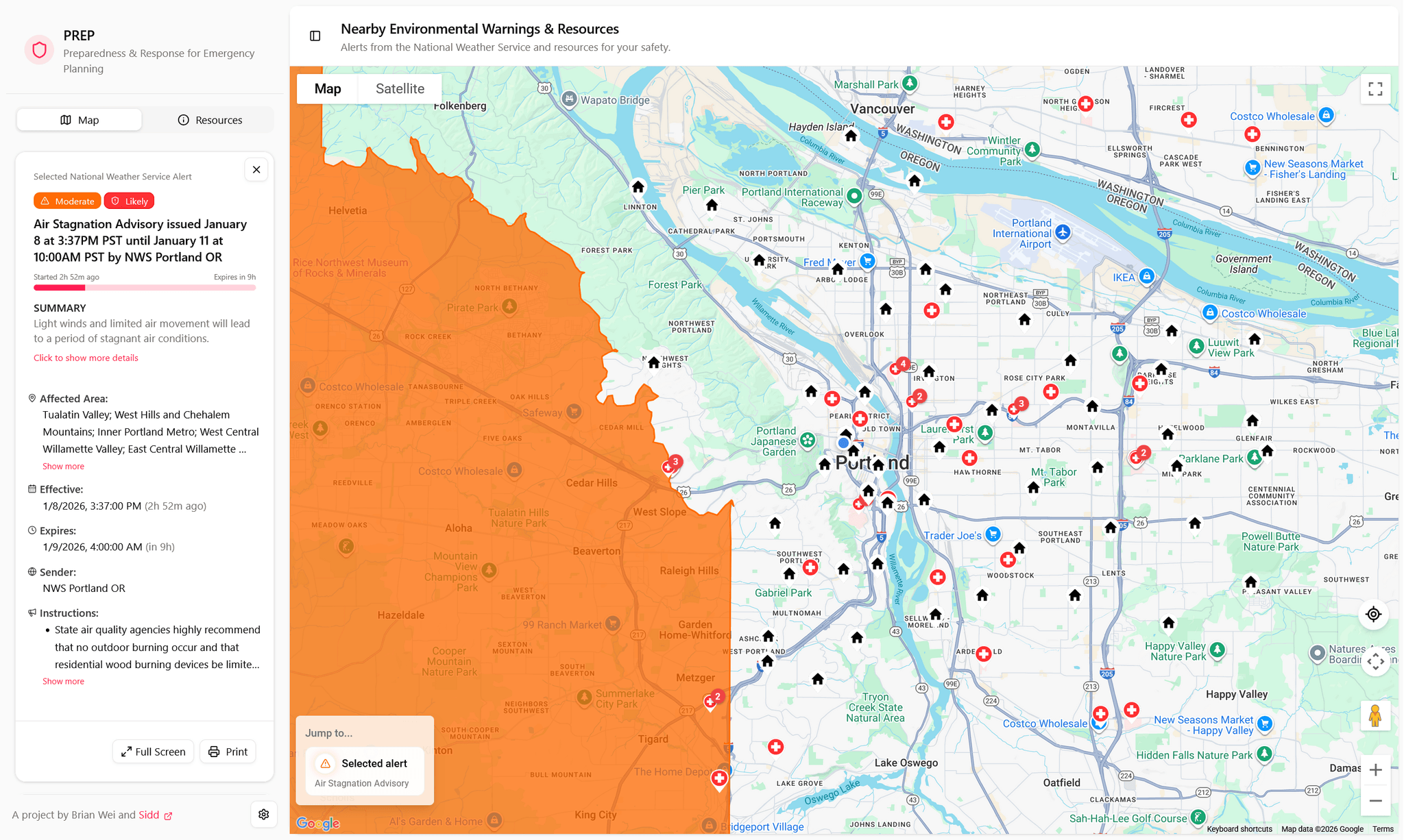 With the looming risk of a major Cascadia earthquake in the Pacific Northwest, my colleague Brian Wei and I created PREP to empower anyone, anytime, on any device with access to emergency warnings, nearby shelters and hospitals, and other preparedness information at the moment they might need it most Because it's a web application, there is no need to download anything. Users simply open it in a browser from a phone, tablet, or laptop and are ready to go. This means accessibility from anywhere.