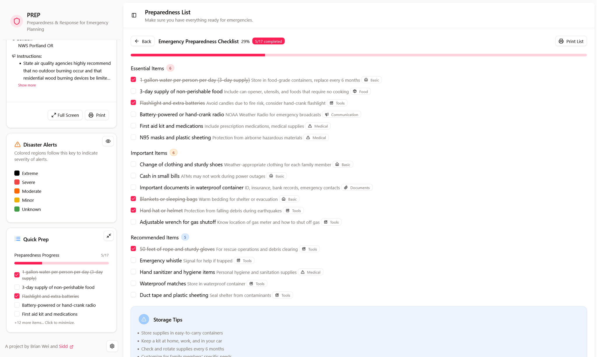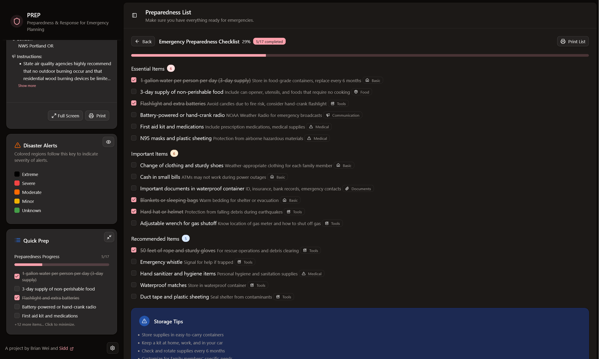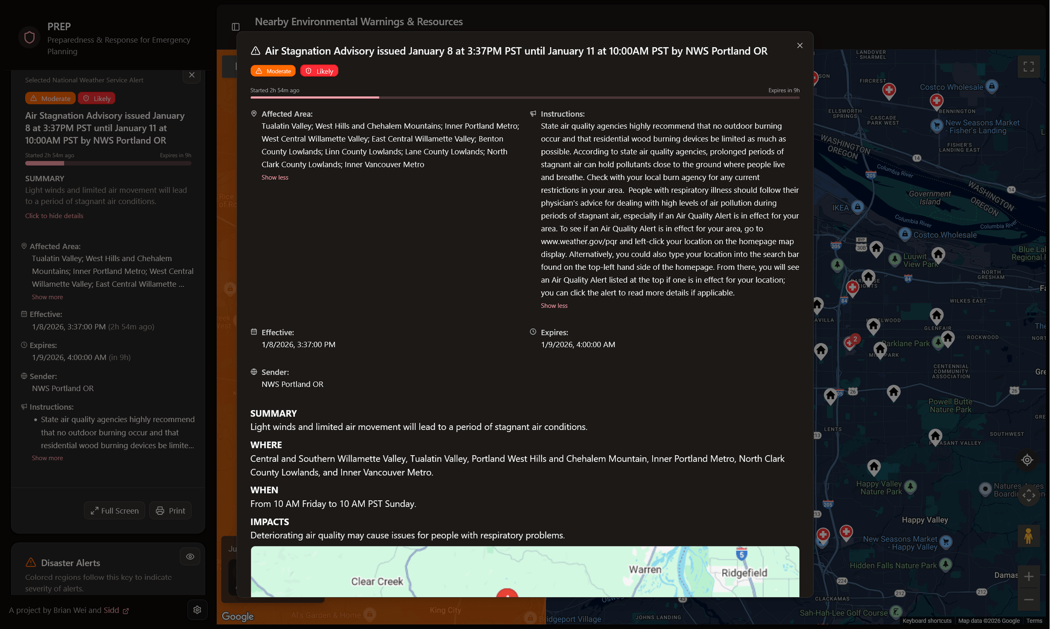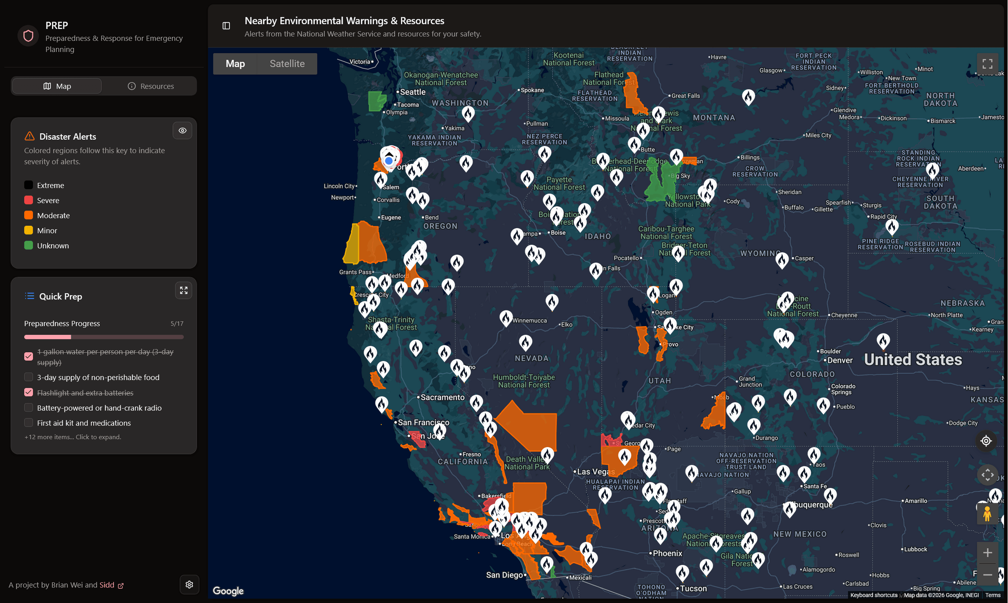 With the looming risk of a major Cascadia earthquake in the Pacific Northwest, my colleague Brian Wei and I created PREP to empower anyone, anytime, on any device with access to emergency warnings, nearby shelters and hospitals, and other preparedness information at the moment they might need it most Because it's a web application, there is no need to download anything. Users simply open it in a browser from a phone, tablet, or laptop and are ready to go. This means accessibility from anywhere.