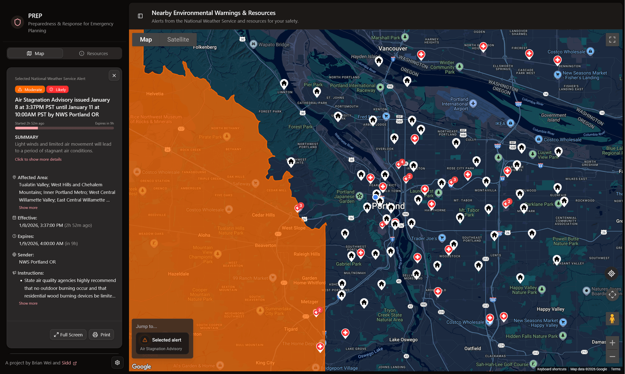 With the looming risk of a major Cascadia earthquake in the Pacific Northwest, my colleague Brian Wei and I created PREP to empower anyone, anytime, on any device with access to emergency warnings, nearby shelters and hospitals, and other preparedness information at the moment they might need it most Because it's a web application, there is no need to download anything. Users simply open it in a browser from a phone, tablet, or laptop and are ready to go. This means accessibility from anywhere.